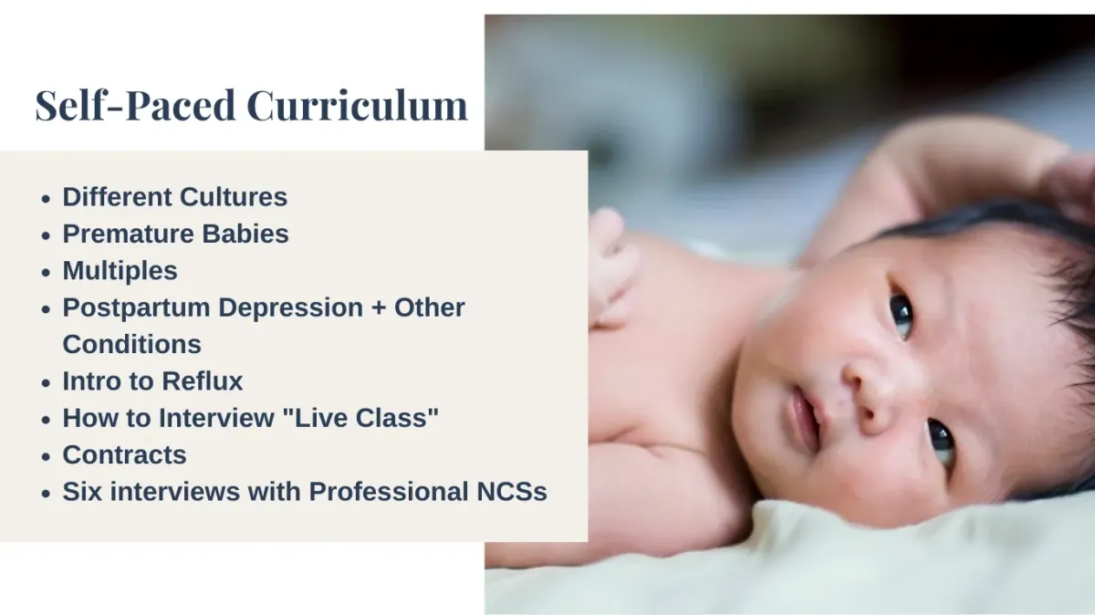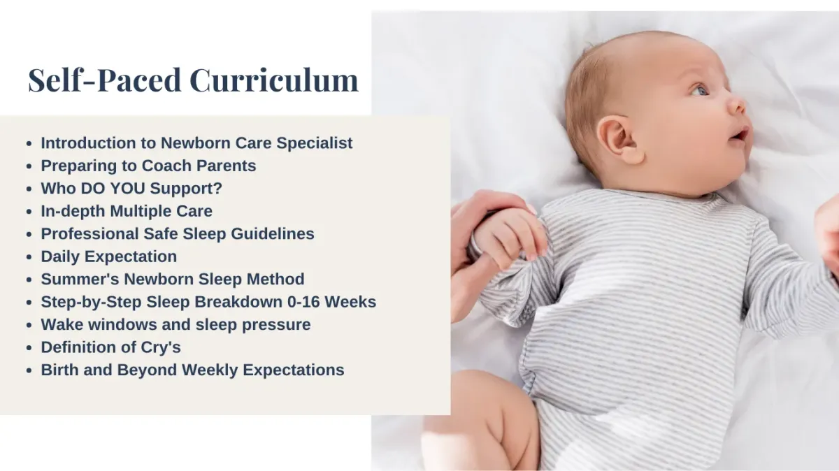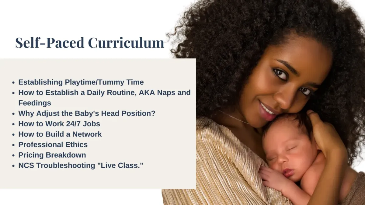 The NCS training is a 30-hour course. In our profession, we cover sleep development in the first training and then teach step by step for the next 16 weeks.